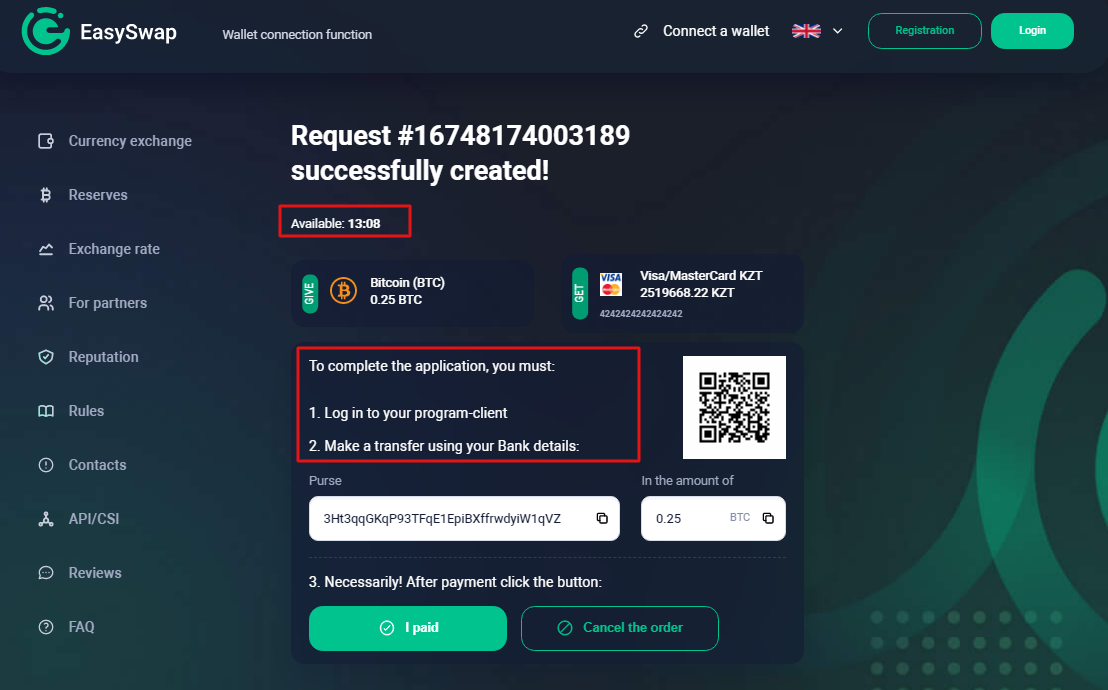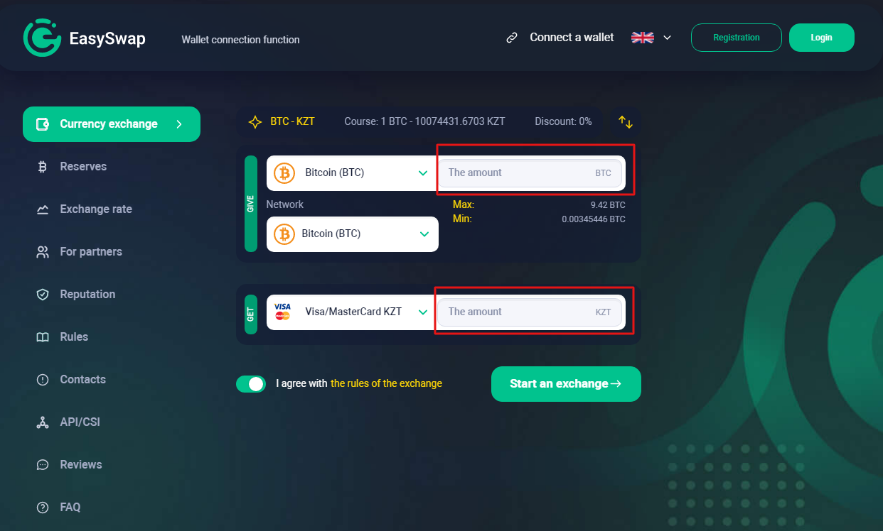 Let's consider the process of creating a request using the example of an exchange in the direction: Bitcoin (BTC) – Visa/MasterCard KZT.