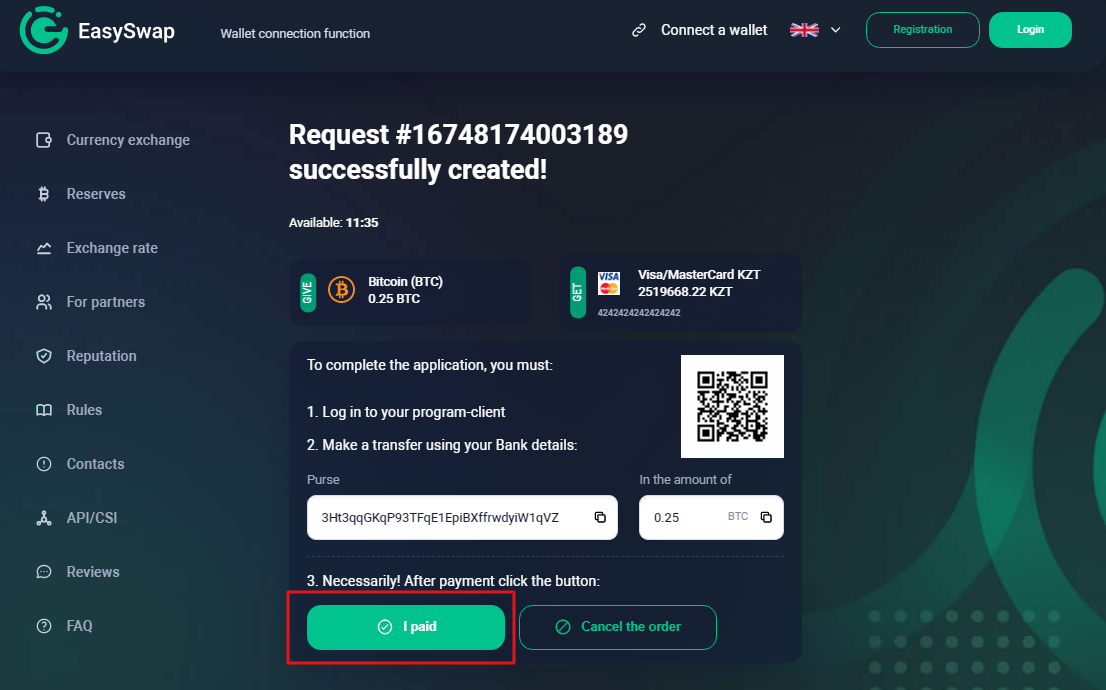 Click "Start exchange", which will mean your agreement with the exchange rules. Please familiarize yourself with them in advance;